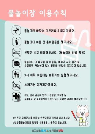 - 자외선 차단제 및 모자: 야외 물놀이장이므로 강한 햇볕에 대비하여 선크림을 꼼꼼히 바르고 모자를 착용하는 것이 중요합니다.