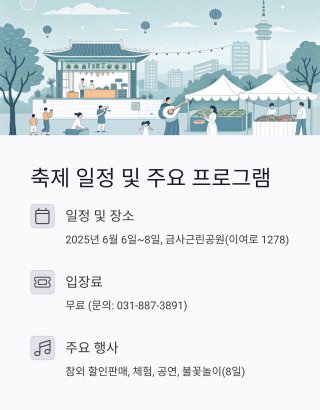 2025년 6월, 경기도 여주시 금사면 이여로 1278, 금사근린공원에서 열리는 이번 축제는 입장료가 없는 ‘무료 축제’입니다. 대중교통은 여주역과 여주종합터미널에서 다양한 버스를 이용할 수 있으며, 임시 무료 주차장도 운영되어 자가용 이용객도 편리하게 방문할 수 있습니다.